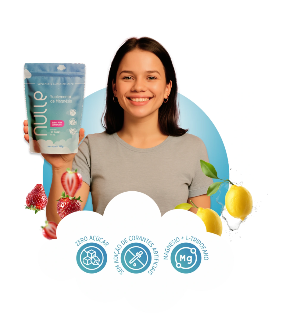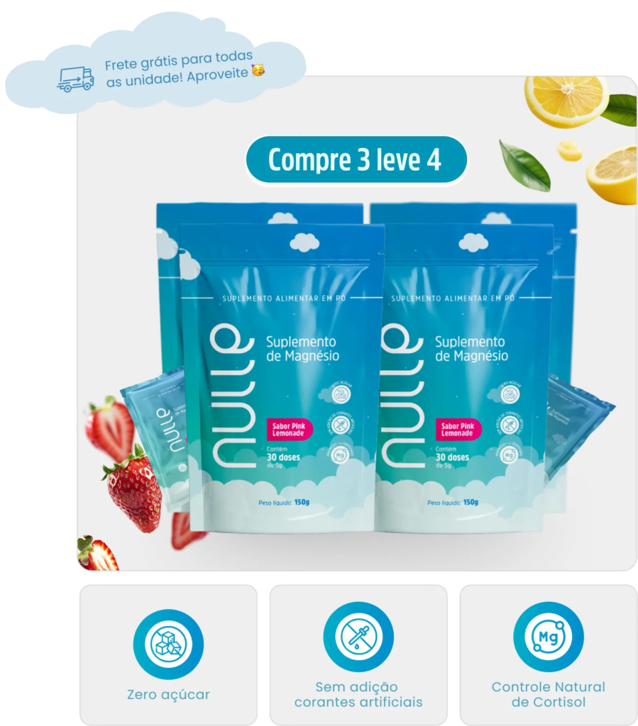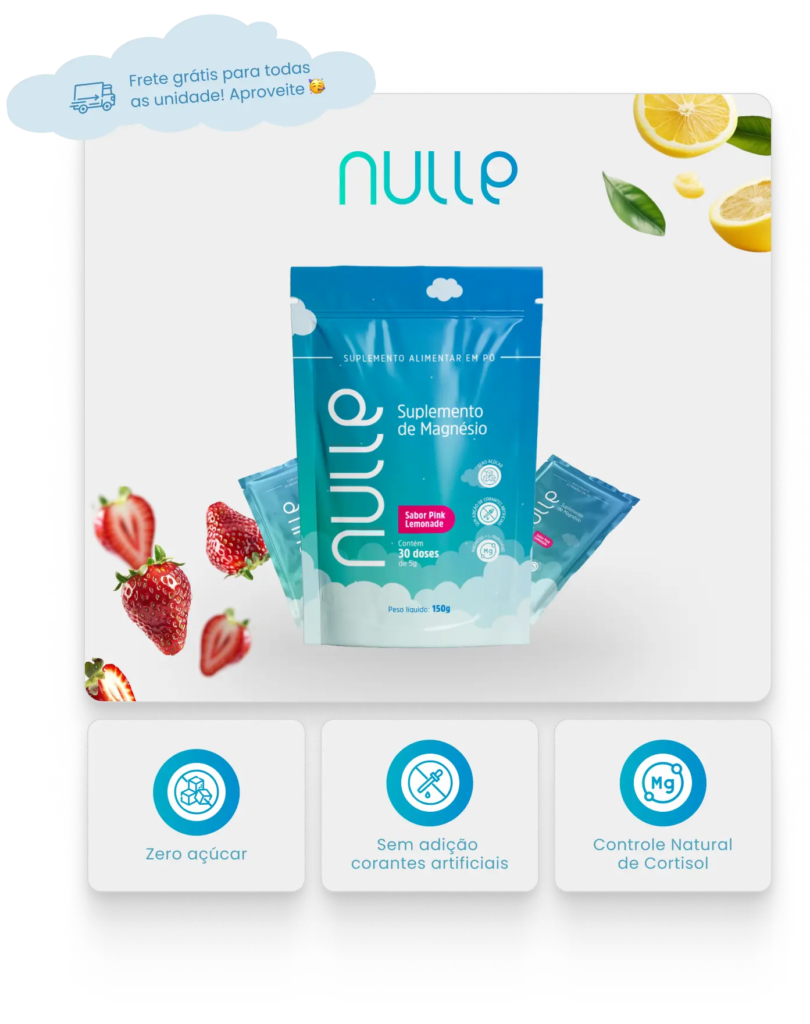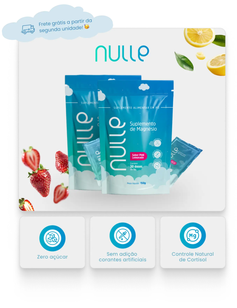 Nulle é um suplemento alimentar em pó com 5 tipos de magnésio + aminoácidos essenciais, criado para reduzir os níveis elevados de cortisol (hormônio do estresse), melhorar seu bem-estar físico e mental e trazer mais beleza de forma natural e simples.